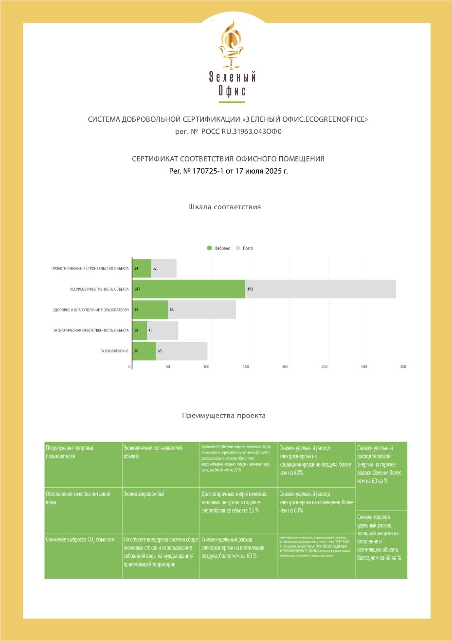 сертификат соответствия GOLD (Зеленый офис - Золото-рейтинг соответствия 63,9%)
